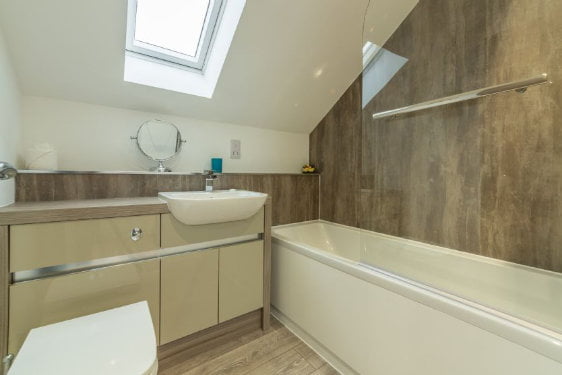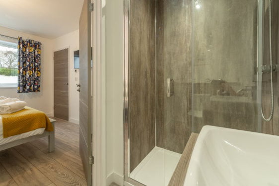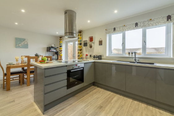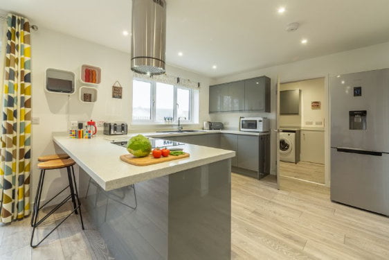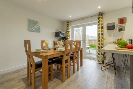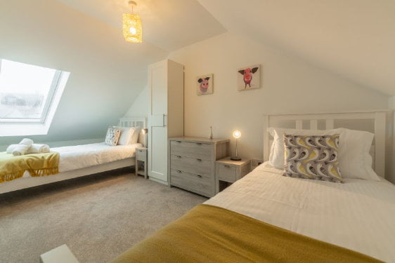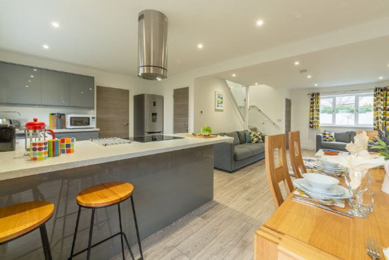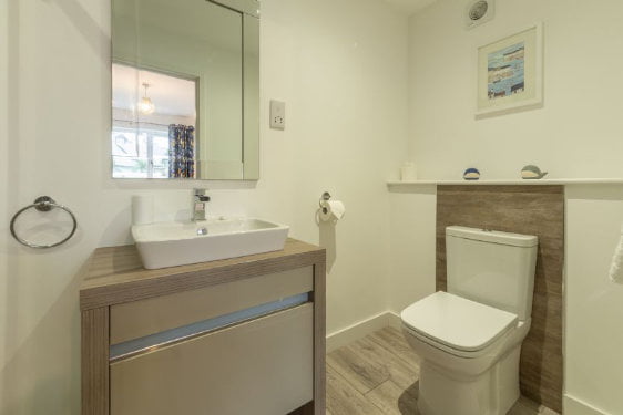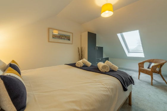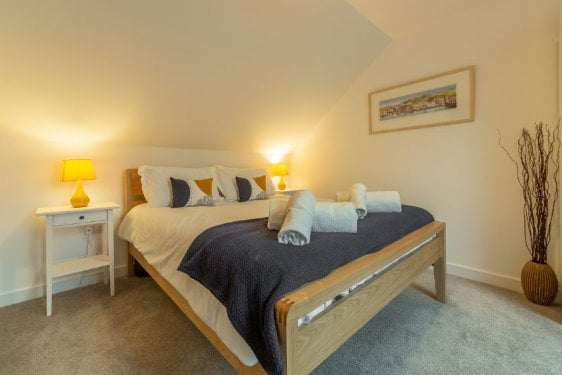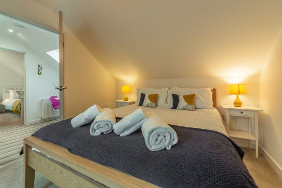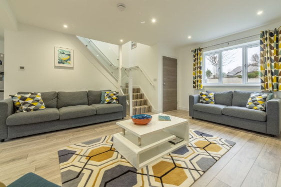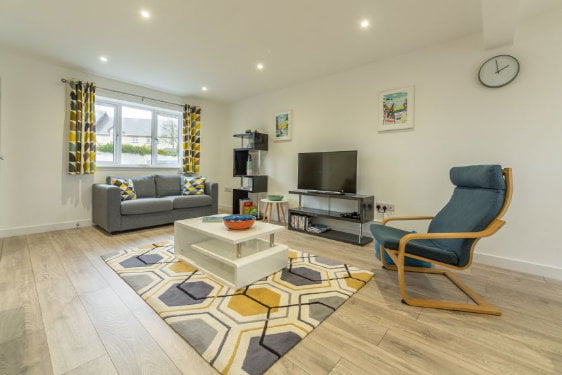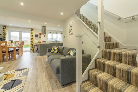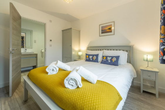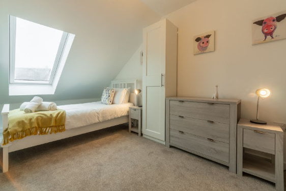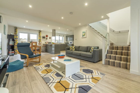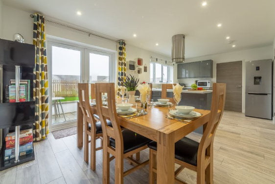 There are comfy sofas and a Smart TV with a DVD player in the sitting room.  One of the three bedrooms is also located on the ground floor and has a king-size bed, Smart television and an ensuite shower room. Upstairs there are 2 more bedrooms  – one with a king size bed and 1 with a twin room.  There is also a super useful study area and a family bathroom.