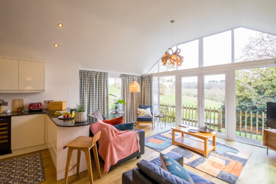 Valley View sleeps 4 in 2 bedrooms (ensuite double and twin bedroom) and sits alongside the field leading down to the lake. You can sit and relax and enjoy the views over our beautiful Cornish countryside from the open plan living room. With a bright contemporary kitchen and large sunny conservatory/dining room Valley view is popular all year round.