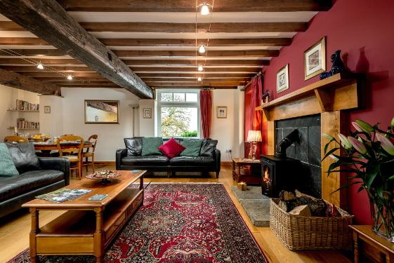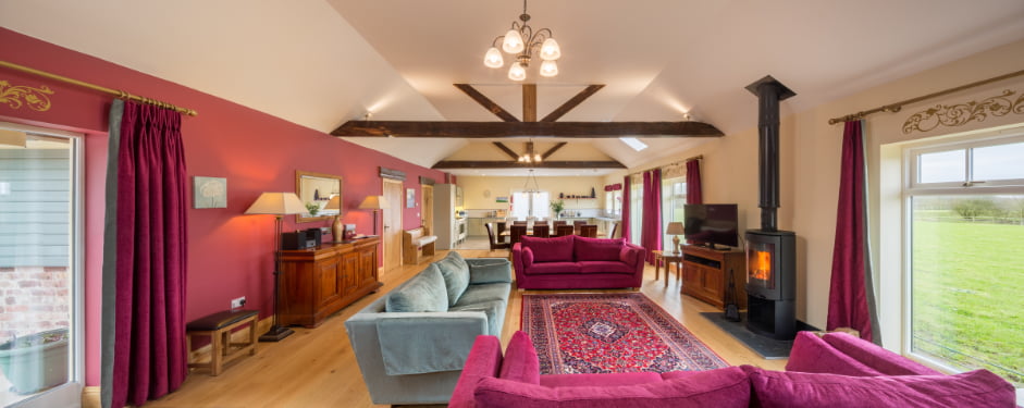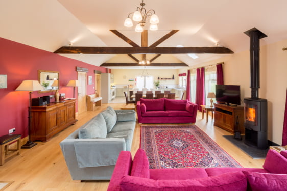 The real wow factor in Granary cottage is the large living room which features a dining area with a large table seating up to 12 people.   There is also a cosy reading area and a wood burning stove.
