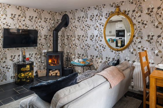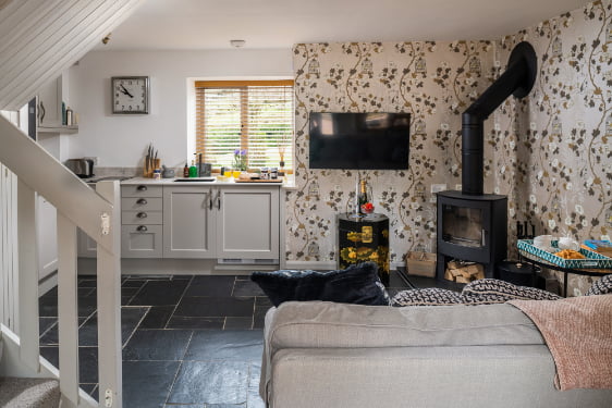 Peacock Cottage is a beautiful detached cottage overlooking the courtyard. It has an open plan sitting / dining area with a tiled floor, cosy log burner, TV and Apple TV. A winding staircase leads upstairs where there are two bedrooms, one with a king size four poster bed and the other with two singles. There is also a modern kitchen with dishwasher and microwave, as well as a family bathroom with a bath and shower. Peacock Cottage has its own secluded area of lawn with garden furniture and barbecue.