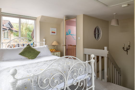 The first bedroom is on the ground floor and has a super king size bed and ensuite shower room as well as a beautiful sunroom complete with comfy divans (the sun room opens up on to a small private terrace and lawn). Above is a bedroom with a super king size zip and link bed (or twin) –this is connected to the family bathroom and has its own balcony with views down the valley.