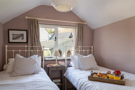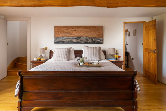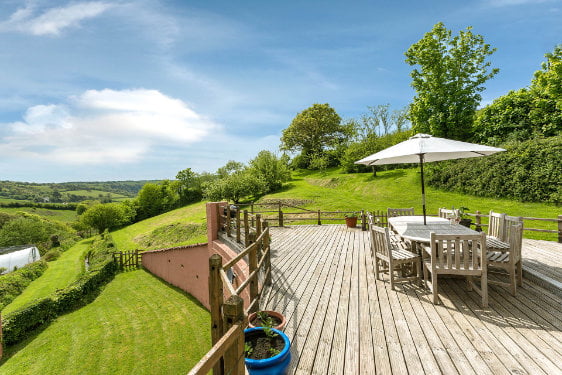 Up in the beams of the barn is a cosy twin bedroom. At the opposite end of the building is the Family Suite which contains a large bedroom (which opens up on to the decking and has views across the valley) with a super king size bed, a dressing room and an ensuite shower room. Above the Master bedroom is another twin bedroom / play room.