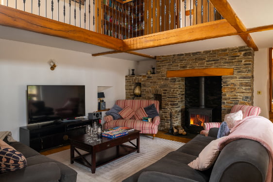 The Old Barn opens up to a large well equipped kitchen (complete with an Aga) and a table sleeping up to 10 people. Leading off the kitchen is a stunning triple height drawing room with a gallery with wonderful views down the valley opening up onto a private deck. A corner of the gallery is used as a snug with a comfy sofa.
