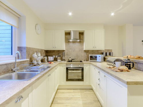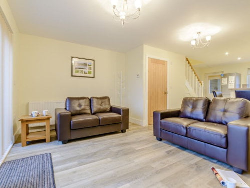 The lodge is bright and spacious with an open plan living area which is characterised by wall to wall window and stunning countryside views. The stylish kitchen has an electric oven and hob, microwave, fridge / freezer, dishwasher and washer / dryer. The lounge has comfy sofas, a SMART TV/DVD and large patio doors which open up onto a private decking area. There’s also a separate WC.