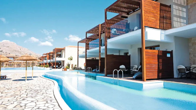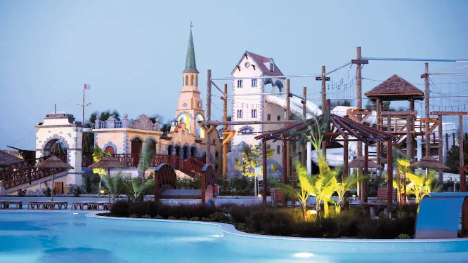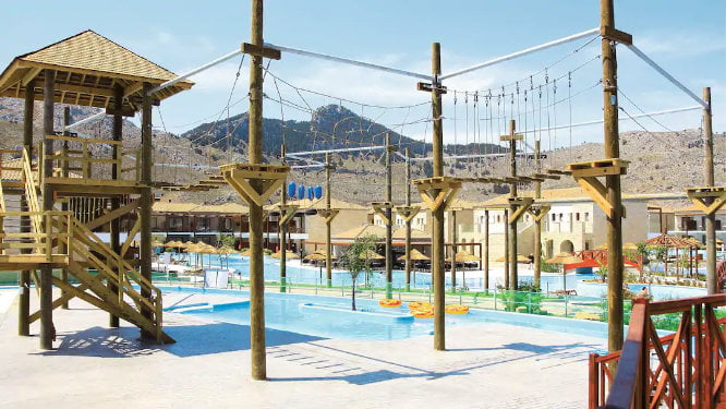 5* hotel with 5 swimming pools, adventure splash park, swim academy and playground. 5 mins walk to the beach. Swim up rooms available.