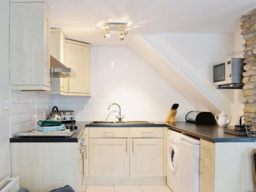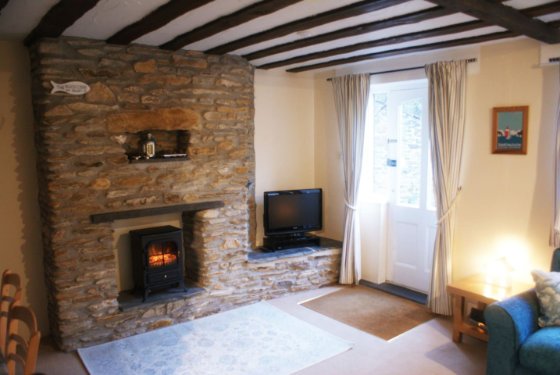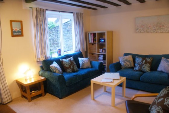The sitting room has comfy sofas and chairs and a cosy fire and the kitchen has a microwave and washing machine.