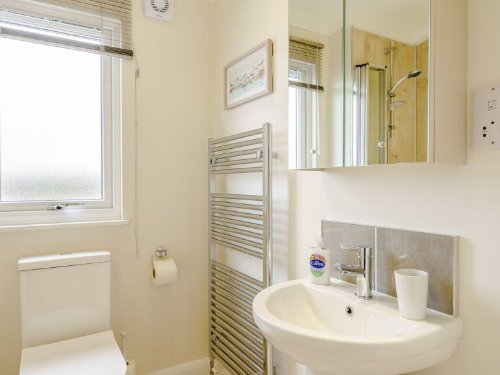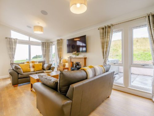 The lodge is a spacious open plan lodge with a bright loving area. It has a super comfy seating area with a Smart TV, floor to ceiling windows and superb sea views. French doors lead out to the decked area which has the hot tub! The kitchen is fully equipped for families with an electric oven, gas hob, fridge / freezer and dishwasher. There is also a handy utility room.