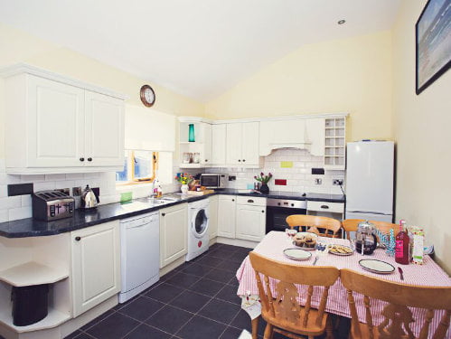 The lounge / dining area has a wood burner so is ideal for cozy evenings after a busy day exploring. The kitchen area is fully equipped with an electric oven, hob, microwave, fridge / freezer, dishwasher and washing machine. The large dining table is perfect for family meals.