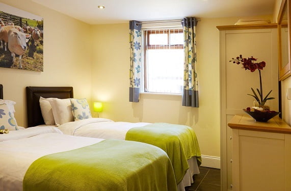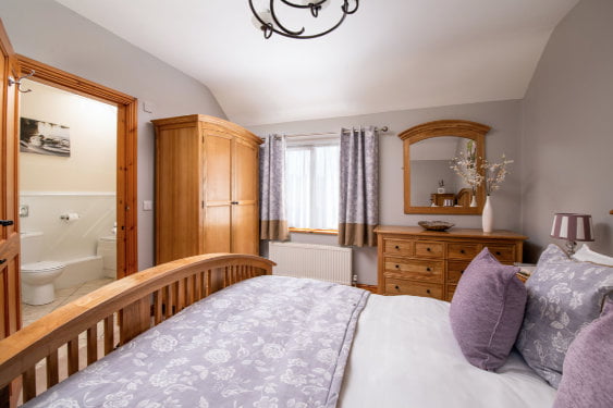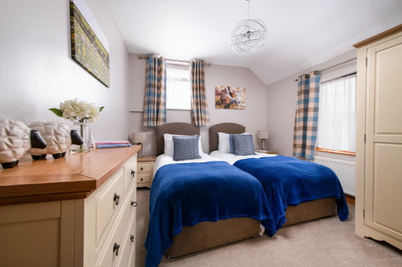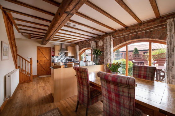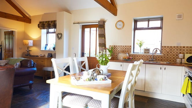 Swallow’s Nest Cottage is luxury cottage with a  private hot tub that overlooks some of the grazing pastures. This attractive cottage include welcoming decor in natural shades, 2 ensuite bedrooms and a light, airy living area including comfortable sofas, a log burner, fully-fitted kitchen, dining area and beamed ceilings. Warm, underfloor heating provided.