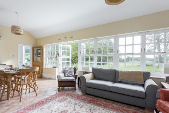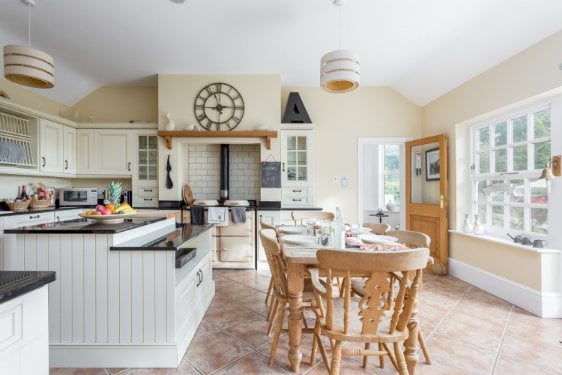 There is a spacious kitchen / diner / TV lounge with a range, electric double oven and hob, fridge, dishwasher and microwave.  Doors from here lead out into the beautiful garden.  This area is perfect for family meals as there is a dining table with seating for 6 people, comfy sofas and a flatscreen digital TV and DVD player.