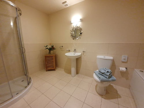 There is also a bathroom with jacuzzi bath, separate shower and WC and a separate shower room with WC.