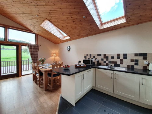 The log cabin is all set on 1 storey and has an open plan living area with a superb kitchen with an electric oven, hob, fridge/ freezer, dishwasher, washing machine, tumble dryer and microwave.