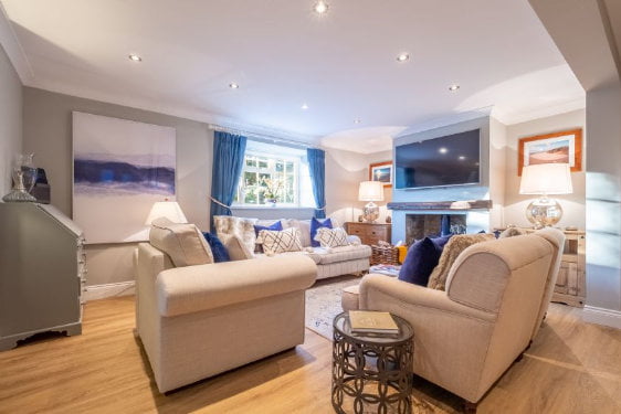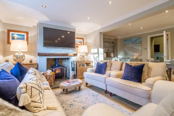 The ground floor has an open plan living area with a sitting / dining area and wood burning stove. The kitchen is really well equipped with French doors leading to the garden and children’s area. The playroom also leads off the living area. There is also a separate snug area with an Xbox and games.