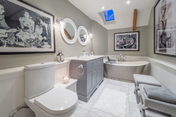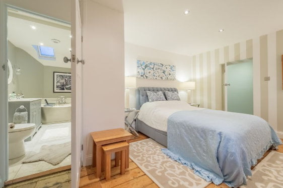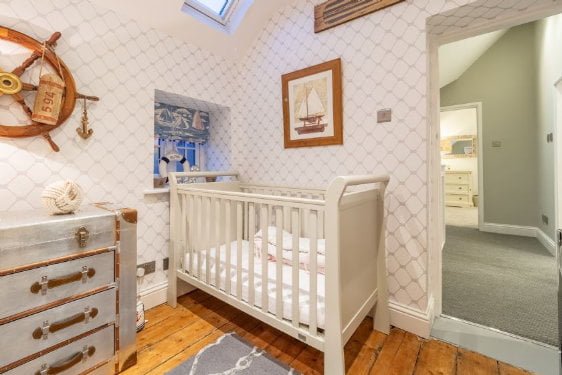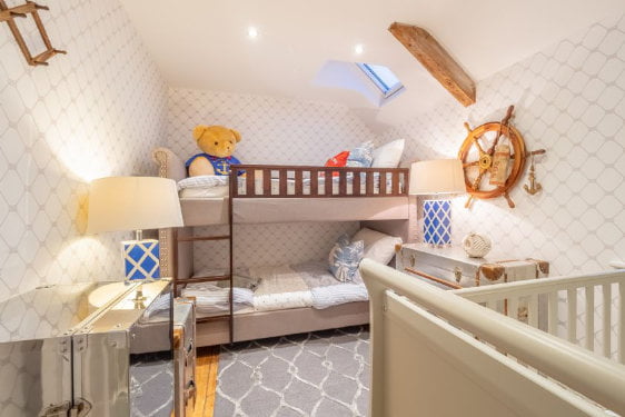 Upstairs there are 4 bedrooms – a master king size bedroom with ensuite bathroom with twin wash basin and a roll top bath. There is a 2nd king size bedroom, a twin room and a cute bunk room with a nautical theme. The third bathroom is upstairs too.