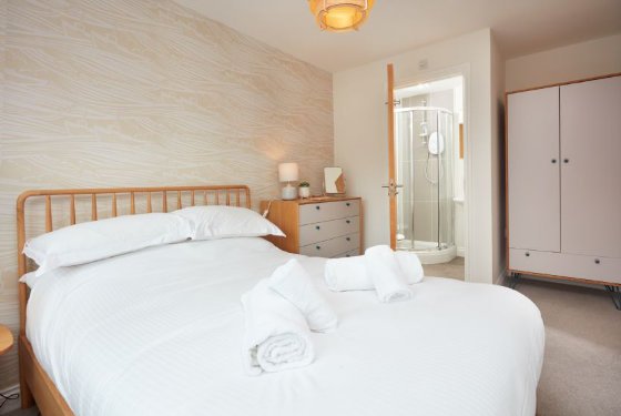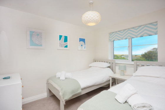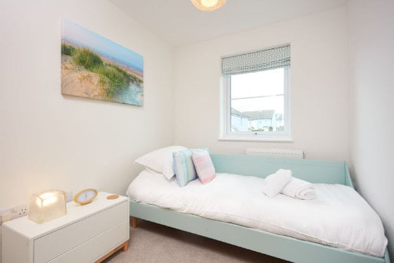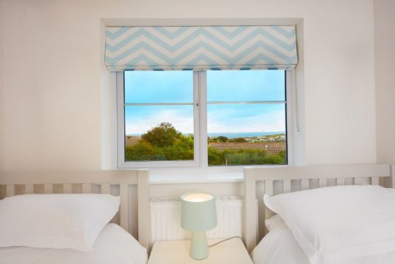 Upstairs there are 3 lovely bedrooms and a modern family bathroom. The master bedroom has an en-suite shower room and double bed and just across the landing is a twin bedroom with beautiful views to the sea in the distance. The 3rd single bedroom has a comfortable day bed.